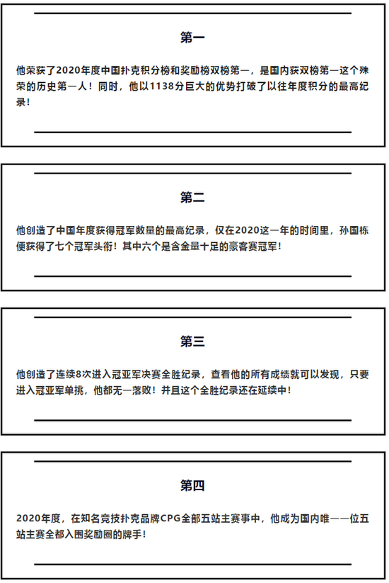 短短时间,孙国栋创下了无数扑克记录,连续两届老虎杯含金量十足的“双冠王”、单挑阶段恐怖的夺冠胜率、一年多个豪客赛冠军、长期霸占多个扑克排行榜首位,积分打破历史记录。。。。。。可见他恐怖的历史战绩。