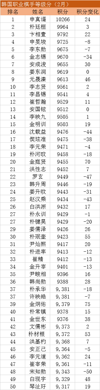 朴廷桓在2月取得6胜1负,等级分最终定格在9964,较上月上涨3分,落后申真谞302分,连续15个月位居第二。