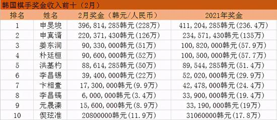 2月奖金榜,申旻埈凭借LG杯冠军奖金占据榜首,申旻埈凭借在农心杯上的四连胜夺冠位居第二,其他棋手收入则为韩联赛的胜局奖金。