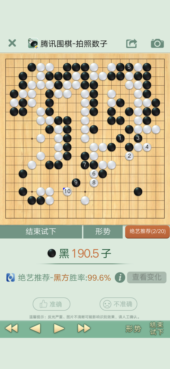 使用腾讯野狐围棋最新推出的“拍照数子-绝艺推荐”的查看胜率功能,可以很明显地看到即便白棋连回右上,黑棋的胜率也接近100%。这样大优的棋也能输掉,难怪河野五段“忍一时越想越气”。