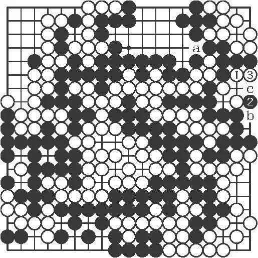 4月5日的这盘棋已经收完了全部单官,是执黑的冈田结美子七目半大胜的局面。冈田觉得无棋可下,选择了“PASS”,仲邑堇立即在黑棋空中下出了白1紧气的好手,黑2如在3位打吃将出现劫争,实战白3后白棋在b位扑,同样免不了出棋的结果。发现了自己严重错觉的冈田只好中盘认输。