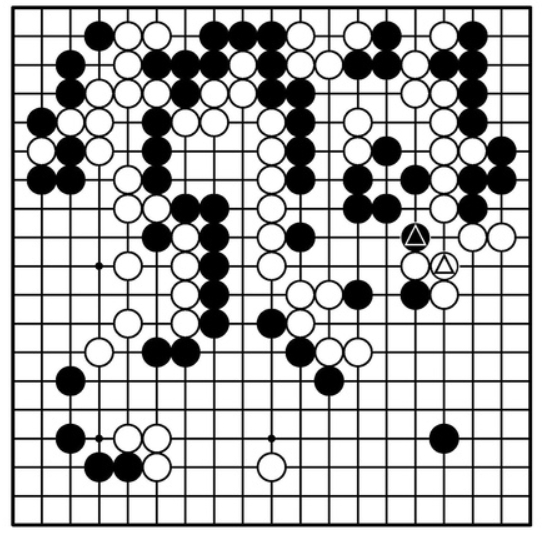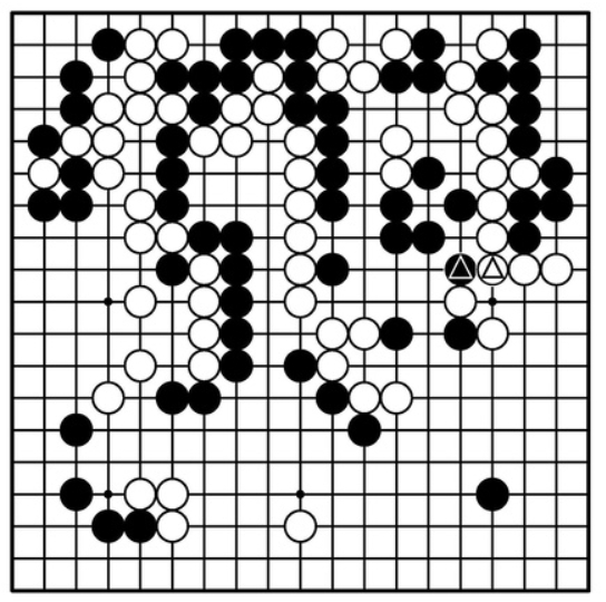 比赛的争议出现在中盘阶段,根据名人战主办方《朝日新闻》的报道,执黑的河野征夫黑121尖(黑三角)时,尚司和子白122在下图中接住(白三角)。这当然是一步昏招,黑棋只要断掉右上一串白子,棋局就结束了。