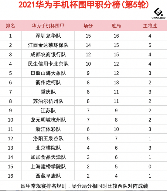 5月12日,2021华为手机杯围棋甲级联赛第五轮在浙江长兴战罢;结果龙元明城杭州队主将丁浩力克队申真谞,助队2-2主将胜德比苏泊尔杭州队;重庆队杨鼎新击败民生信用卡队柯洁,带领队伍3-1获胜。