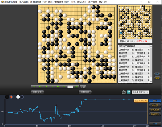 上野爱咲美这两盘棋也未能逃脱魔咒一般的安排,从胜率曲线就可以看出,藤泽里菜是怎样一步步忍耐待机,成功逆转。上野第一局走错死活题,第二局大小判断偏差,可能她面对藤泽里菜时已经有了心理阴影,对自己后半盘过度不自信才如此鬼使神差。