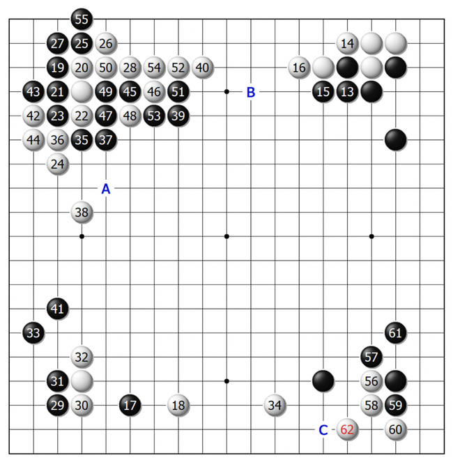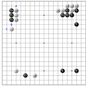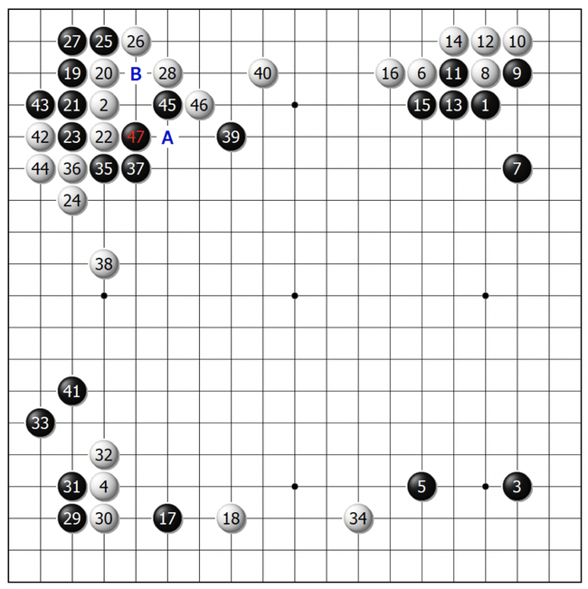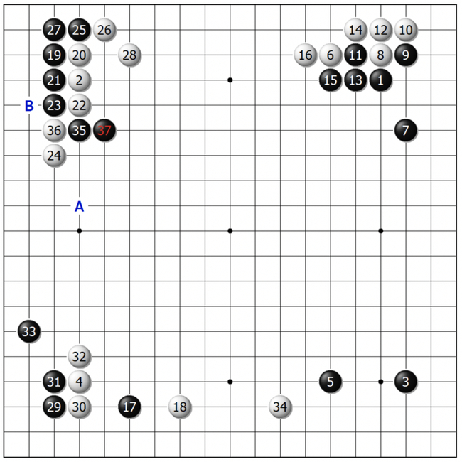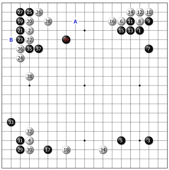 实战黑25,27选择了简明的下法,是因为有17和18的交换,25想抢先手于29位点三三。黑棋这样布局是快速的下法。