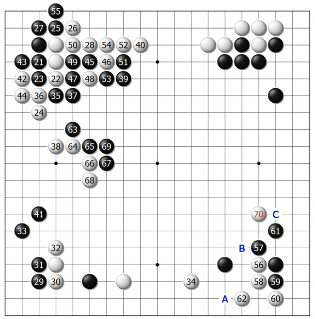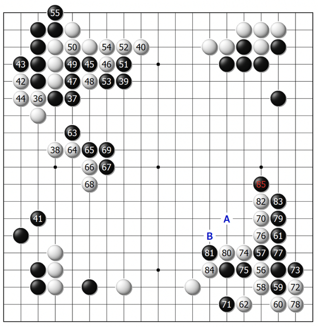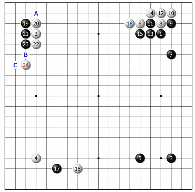 这盘棋老江执黑,小范是白棋。布局白8,10托了连扳,黑19点三三,双方都弈出了AI的推荐下法。24飞时,黑棋局部有三种选择。