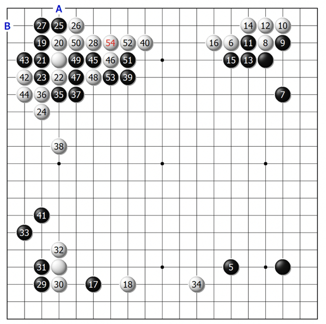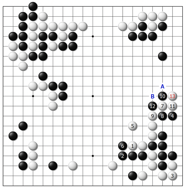 江维杰:白棋应该1先贴掉,如此进行至13,以下变化十分复杂。黑棋大致是有A和B两种选择,关系到弃子转换和判断。