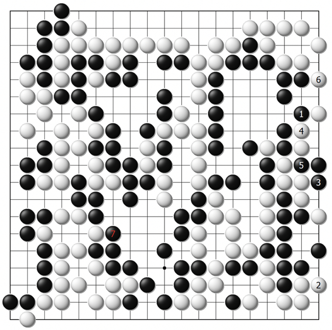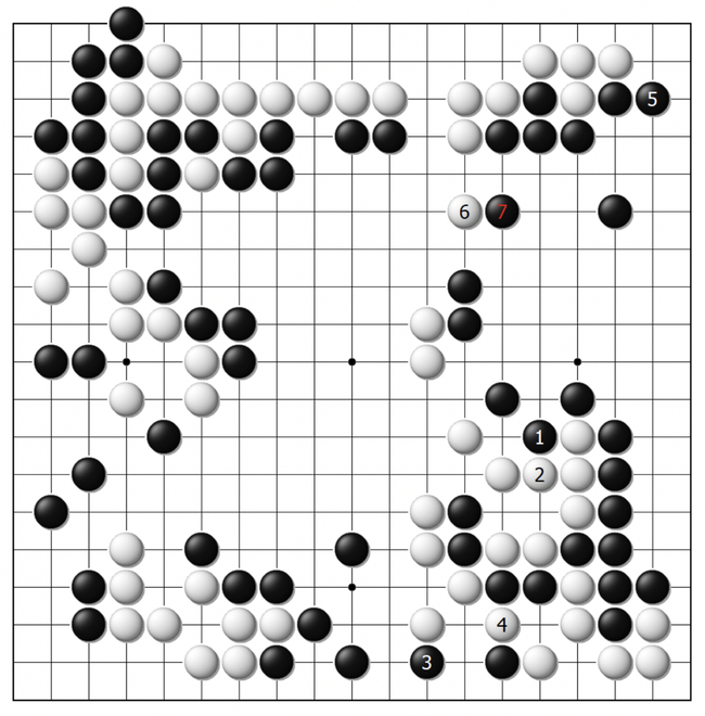 AI推荐黑棋1,3的下法,如此至7是细棋。AI判断是白稍好一点。