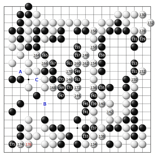 177以下黑落了后手,三子还没吃掉,黑棋亏损。