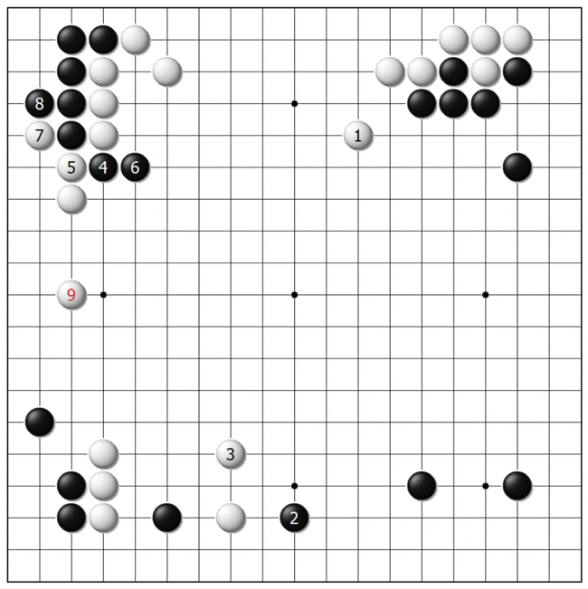 江维杰:白棋就7扳了9拆二,这样白1一子的位置相对于实战,更有利于左上角的战斗。