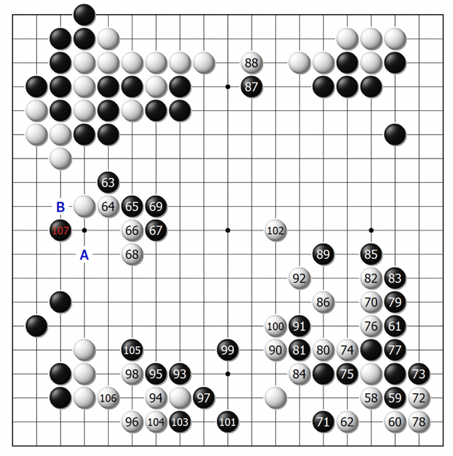 108,110,112被黑棋先手便宜了。缩小了一些差距。