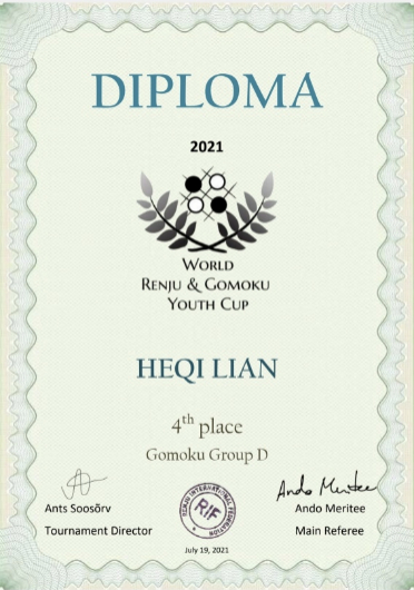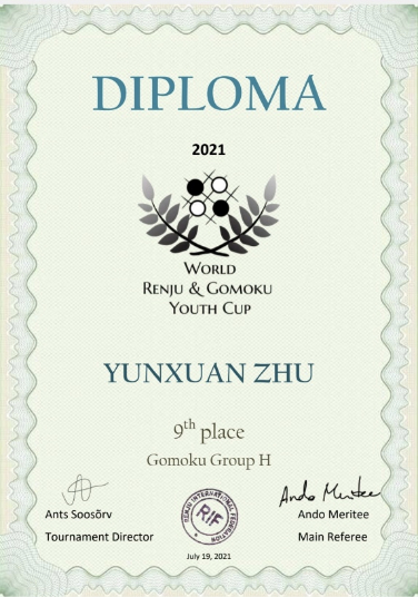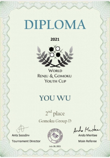 由国际连珠联盟主办的2021年世界青少年五子棋锦标赛7 月19日在vint.ee网落下帷幕,青云里小学的吴悠获得gomoku项目亚军和renju第三名。