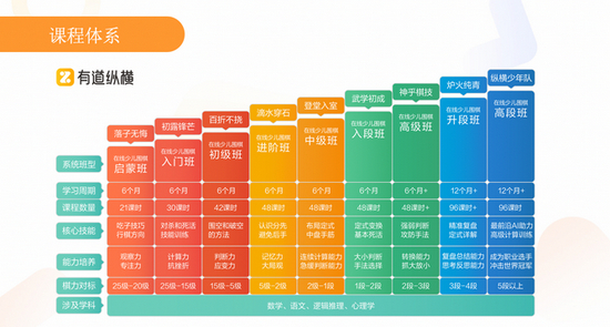 有道纵横的围棋教学体系分为,从启蒙班到高段班的9个教学阶段,每个阶段都有一个固定的名称,名称便代表了这个阶段特有的教学目标。
