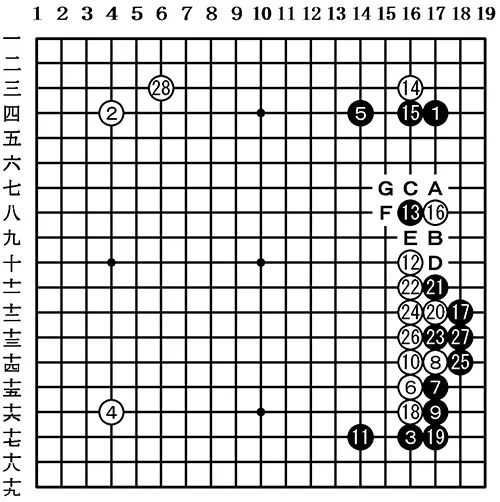 山下敬吾的下一手棋值得关注。此时山下敬吾看着棋盘的右边,这个时候选择黑D的话白E、此后黑B、白F、黑C、白G交换之后,黑棋的收获其实并不大。