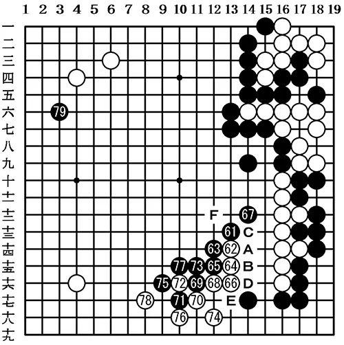 然后双方推车到黑57,白58选择了扳,此时如果选择59位长的话,黑棋就58位再压一次,白61位之后黑A小飞,然后回到白62位,黑69位。这样的话即便让白棋在左边活棋,黑棋依然是可以带着优势稳稳拿下。