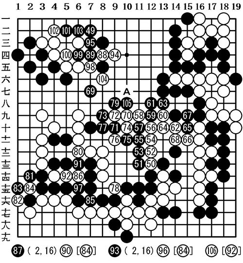 黑79开始重新布局。黑85和黑87的托了虎值得关注,这个时候选择黑87位和109位的连扳,旁观者觉得至少活棋还是绰绰有余,但是这个时候山下敬吾坚持自我。白88和白90选择开劫,想要借此机会带动整个局面。