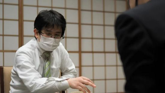 4月5日,在樱花树叶盛开的时候,这盘棋在东京的日本棋院进行。执黑的山下敬吾戴着白色口罩,而执白的安斋伸彰戴着黑色口罩,都坐在了幽玄之间里。担任这盘观战记的我,戴着黑色口罩,而记录员则戴着白色口罩。