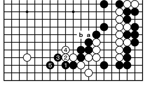 但是这个时候选择白1又会如何呢?黑2和黑4之后,黑6的跳是好型,之后a位碰就会非常麻。看上去这盘棋依然是黑棋优势。