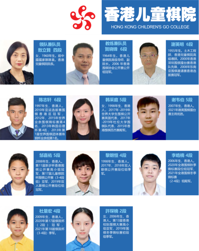 队伍依旧由敖立贤四段担任领队及队员,贺晓峰6段担任教练及队员。由于本次队伍全部由香港儿童棋院的老师和学生组成,从团队配合的角度来看,队员之间默契度高更有利于比赛发挥。此外,通过参与本次赛事,既能展现香港本土棋手的实力、风貌,也能让棋院的学生们更团结、更有参与感。