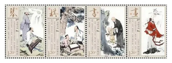 除了这些具有特殊意义的稀有昂贵邮票外,中国还存在以四大艺术瑰宝为邮票图面的特种邮票——“琴棋书画”,并分别以“高山流水、弈秋课徒、怀素临池、道子画壁”诠释中国艺术的典范。