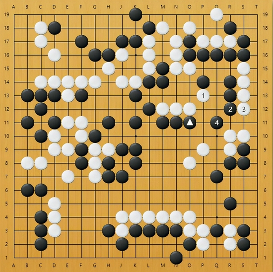 图4:实战聂卫平在1位粘,黑棋中央全部走好了。右边的处理曹薰铉早已成竹在胸。