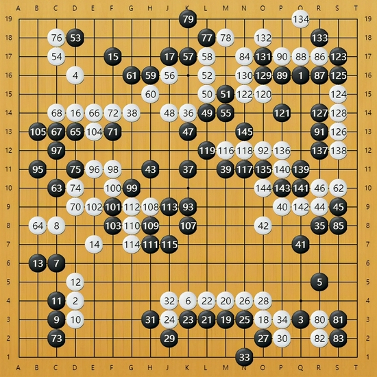 图1:曹薰铉执黑对阵聂卫平。这盘棋执白的聂卫平罕见地用出了“宇宙流”,曹薰铉黑棋空投进中央,这块棋的治孤一直是本局的焦点。