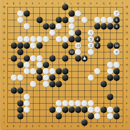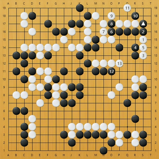 图6:接上图,双方贴身肉搏,进行至黑10尖断,白棋难以为继。不过曹薰铉认为这里不是聂卫平的误算,应该是感觉局势无望,找认输的借口。这盘棋白棋的败因还是前面没有对中央黑棋形成有效的攻势。