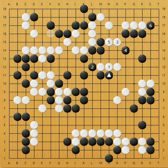 图2:中盘阶段,聂卫平冲击黑棋中央,曹薰铉下出了巧妙的化解手段,黑4挤,巧妙弃子走厚。