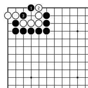 白△位扳之时,黑1在一路点,白2再扳长气时,黑3在1路并是极其漂亮的手段。此后双方正常应对,黑弃掉1、3两子而将白滚打包吃一气呵成。此形亦被称为“黄鹰搏兔”。