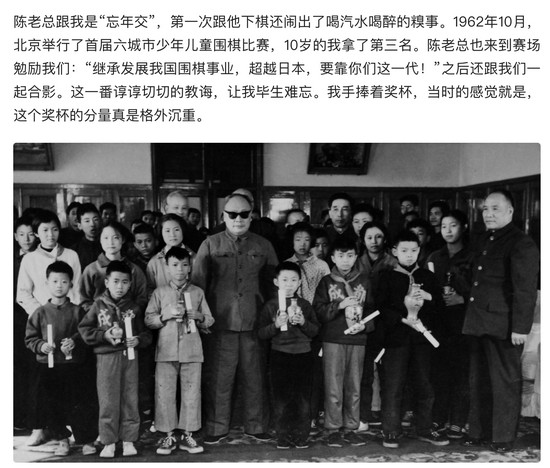 聂老在文中写道:“1962年10月,北京举行了首届六城市少年儿童围棋比赛,10岁的我拿了第三名。陈老总也来到赛场勉励我们:‘继承发展我国围棋事业,超越日本,要靠你们这一代!’之后还跟我们一起合影。这一番谆谆切切的教诲,让我毕生难忘。我手捧着奖杯,当时的感觉就是,这个奖杯的分量真是格外沉重。”