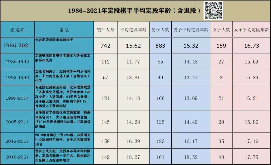这三十多年间定段赛的赛制历经多次调整,从一开始的仅面向专业队选手到放开、分设男女组、男子增设预赛、U18年龄限制、骨龄测试+低龄优先政策(后取消)又逐步放宽到U25并增设了成人组,总体来讲定段年龄是逐渐上升的。