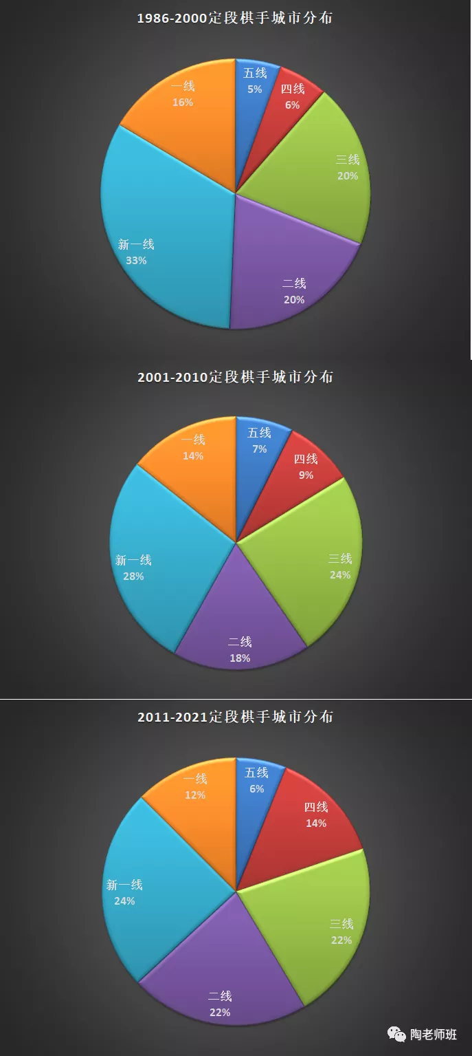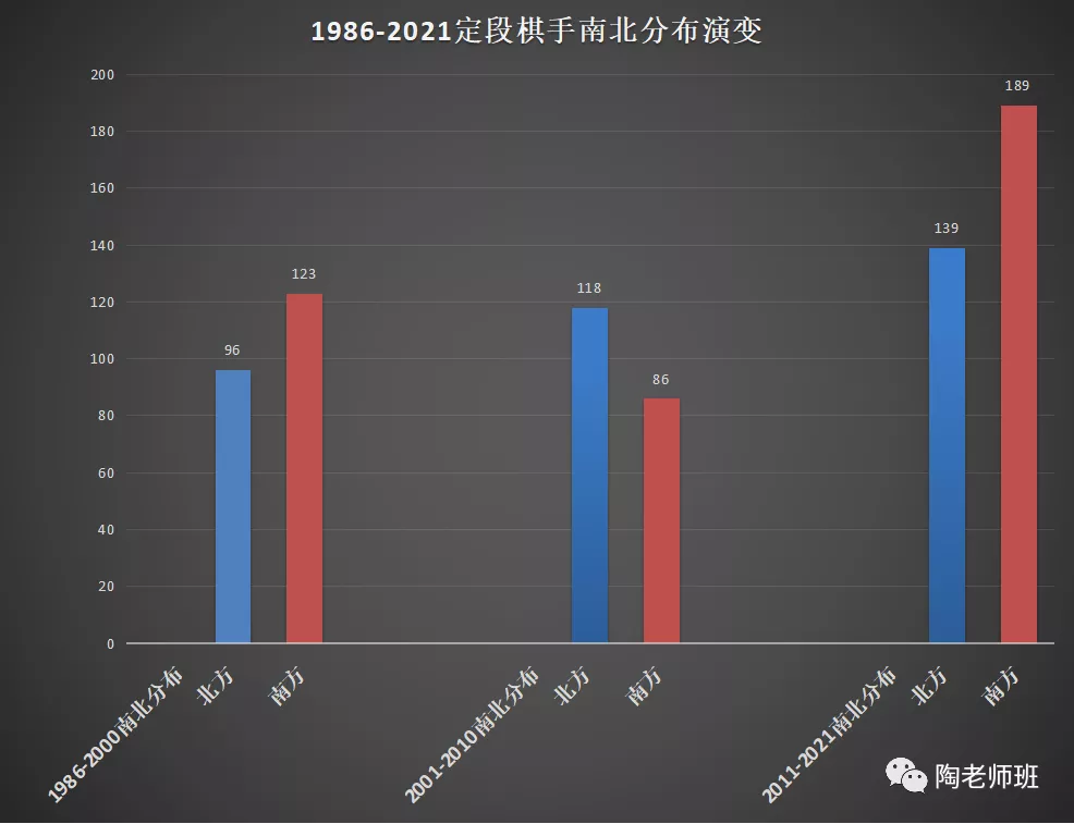 定段赛的参赛选手,或者说职业棋手们从一开始的各省围棋队(体工队)队员,到本世纪头十来年的北京道场冲段少年,再到近些年杭棋一枝独秀,也侧面反映在了南北分布里,好似一个轮回。随着近年来各省市少年队陆续成立,笔者预测未来些年南方仍将继续占优。