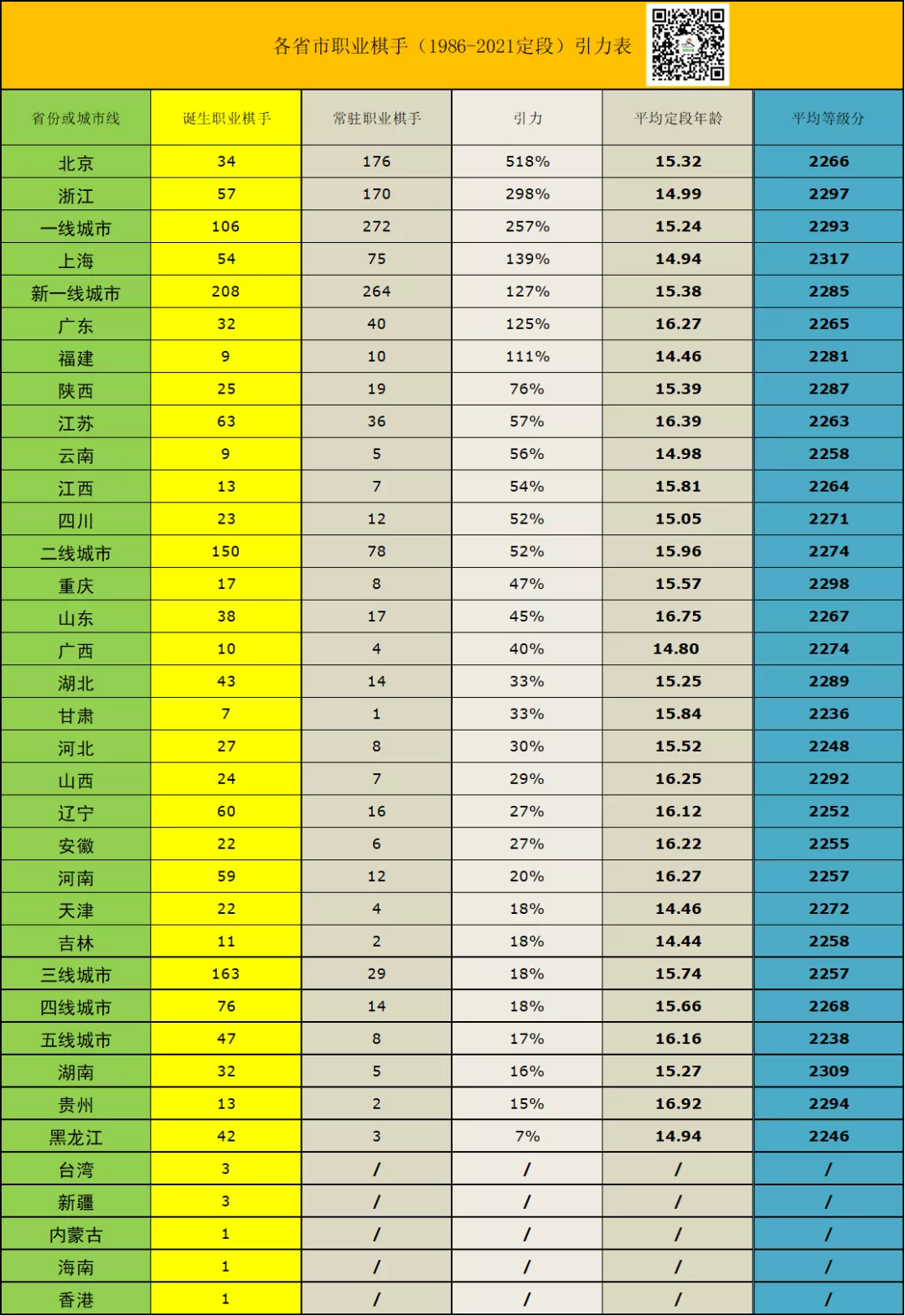 需要注意的是,统计到常驻数据的棋手只占九成左右,有部分棋手远赴国外属于“流失人口”,但总体来讲,人才南漂、大城市虹吸现象明显。