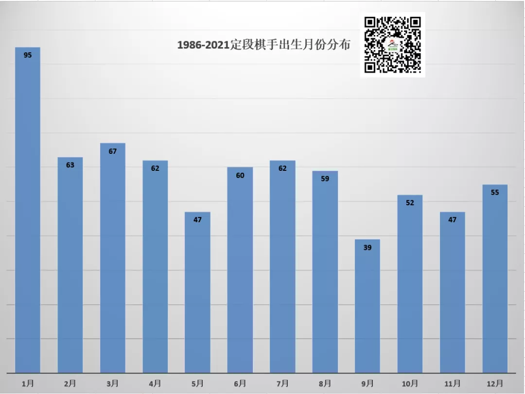 1月夸张的比例甚至让我怀疑是不是数据出了错?在儿童组的比赛中,年初出生确实会占据一定优势。但定段棋手的平均学棋 时间应该接近十年了,这几个月的差距不会很大,可能是少儿组取得了成绩的棋童更容易坚持下去吧!