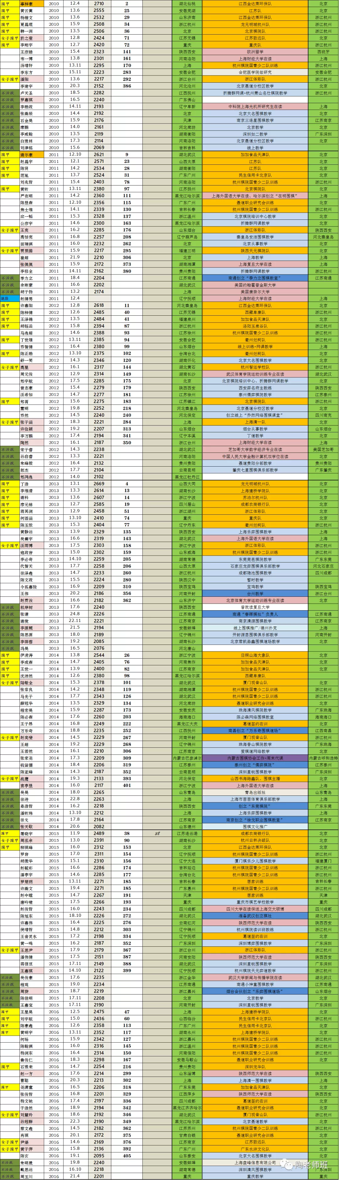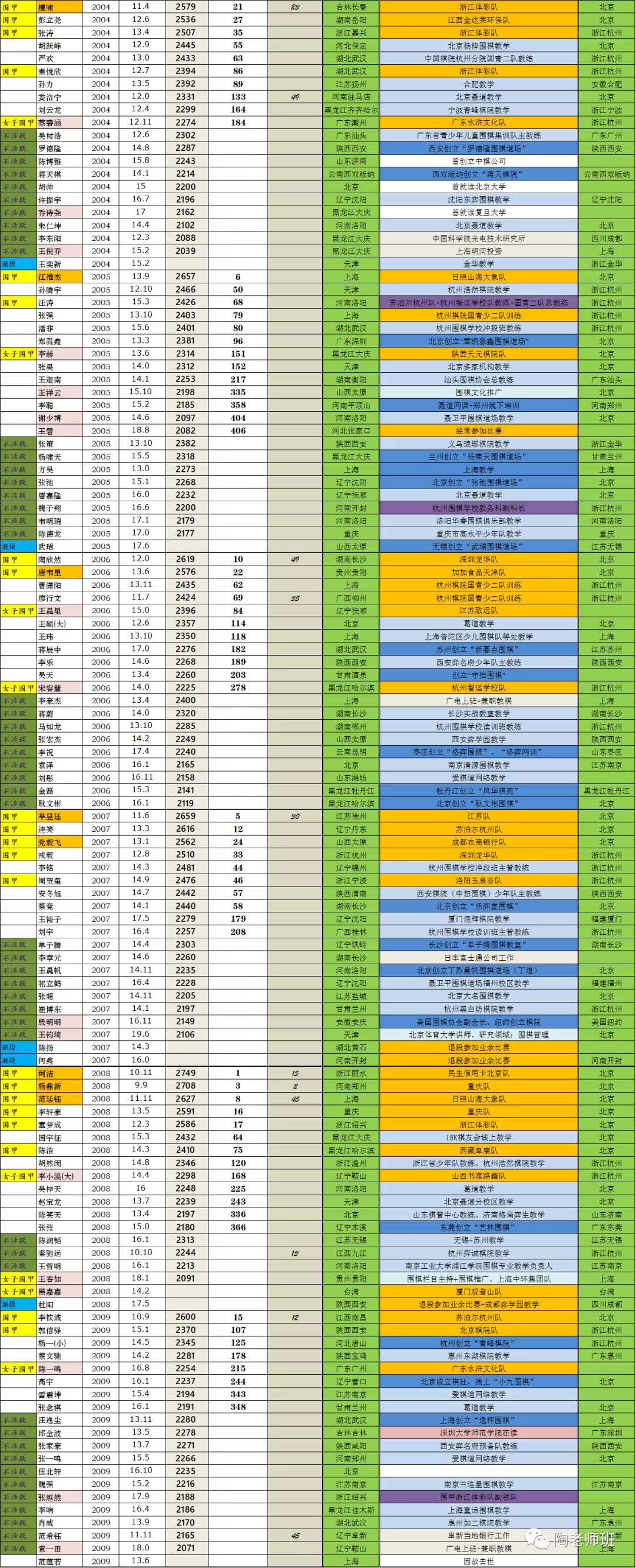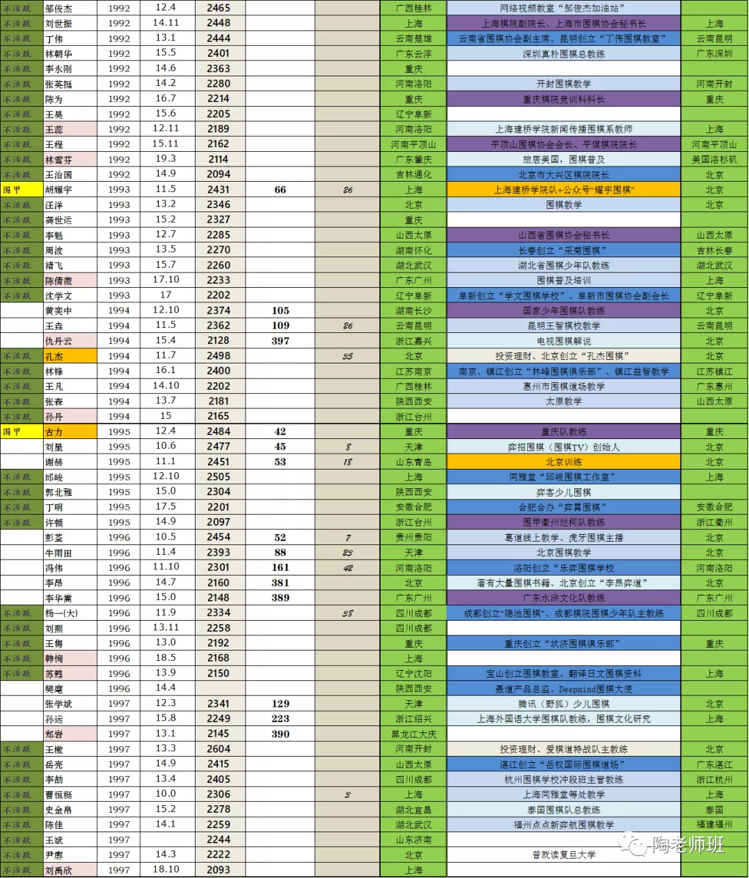 七百多位棋手的现状,围甲队员基本都标了队,全当是“在训”了。很多查不到信息只能空着。可以看到绝大多数职业棋手仍然是“围棋工作者”,部分棋手就算曾去读书,后来仍是回归了棋圈,从事着以下工作。