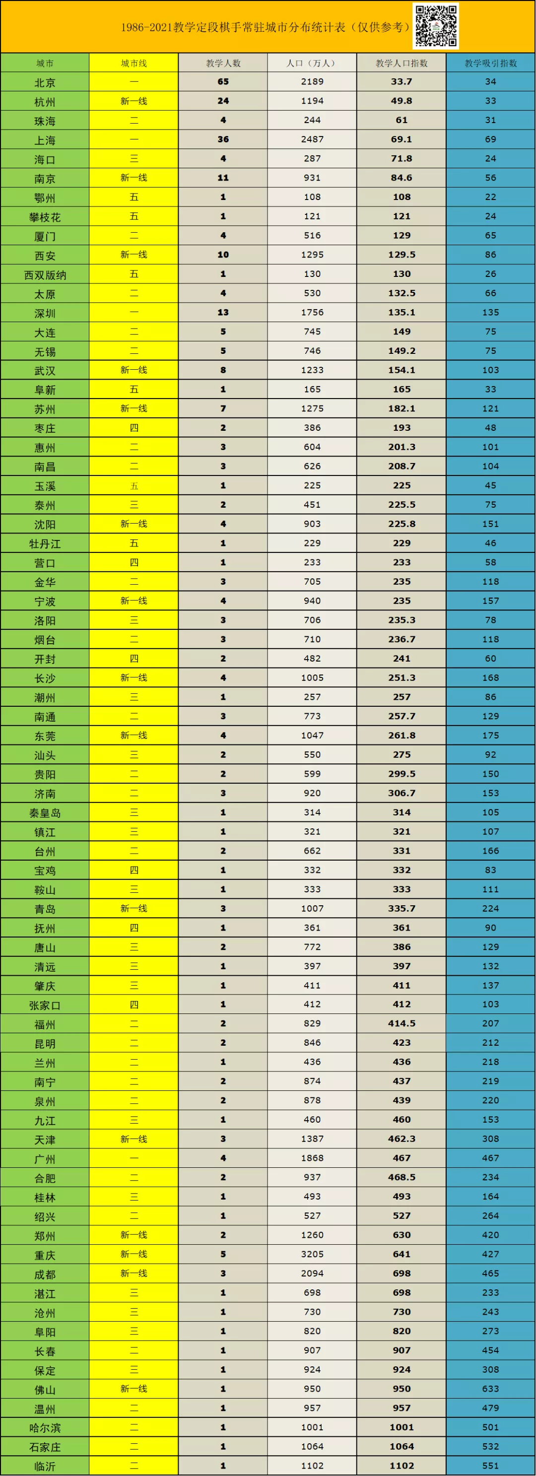仅统计有职业棋手教学的城市,教学人口指数为 教学人数/城市常住人口,数字越小表示“师源”越充分。教学吸引指数为城市线/教学人口指数,仅供参考。