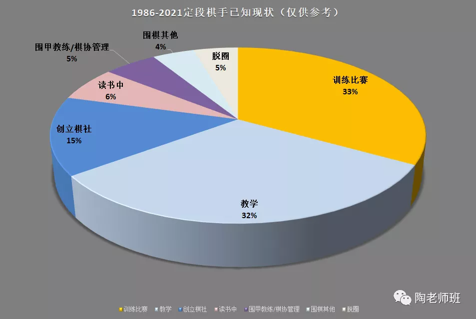 7。去读书,或是脱离了围棋圈--我本来以为有相当比例,统计的时候发现比我想象中要少。且就算是本职工作与围棋无关的棋手,很多平时仍会参与围棋活动。
