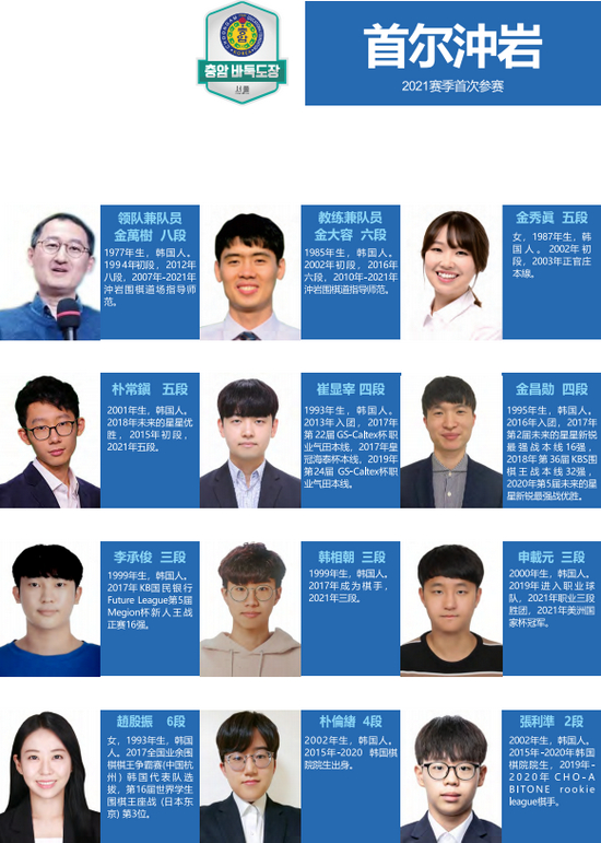 “首尔沖岩队的队员皆出身于韩国最高的沖岩围棋道场,其中包括韩国围棋下一代领军朴常镇五段,大部分队员的年龄刚刚20出头,是以牢不可破的团队精神武装起来的充满青春活力和霸气的队伍,所以首尔沖岩队的活跃值得期待。”
