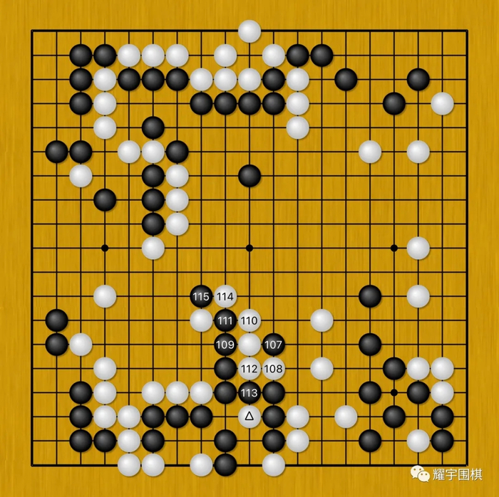 图7:申真谞白108挖之后,唐韦星发现黑109只能从左边寻求生路,如此至黑115断,是双方大致的进行(黑113不可省,不然被白在黑113先手连回白三角一子,黑棋生不如死)。