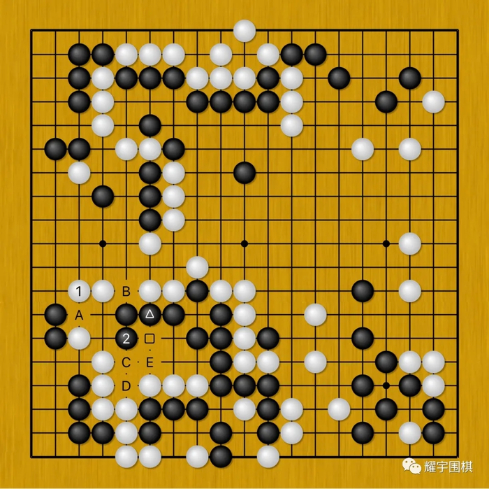 唐韦星黑121妙在保留了黑D位假眼留下了先手余味,先从白圆圈大块的弱点入手(这也是白包围圈中唯一的弱点),然后根据白棋的应对,再决定用哪个先手。