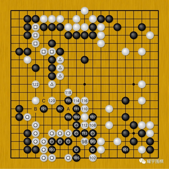 果不出各位棋友们的预料,上篇 春兰杯决赛前瞻专题(1)结尾,申真谞弃掉左上白方块五子换来中央白三角四子,就是为白98屠龙(黑圆圈大块)作准备。