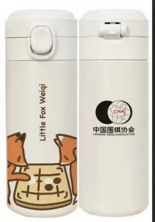 白色款水杯由专业设计师设计,在整体风格上也变得更加符合年轻群体的审美倾向。水杯采用简洁的线条和颜色来突出和表达围棋元素。大家可以看到,杯子的主体图案是两只小狐狸下棋的场景,其中一只小狐狸是黑色的耳尖和尾巴,另一只则是白色的,以此隐喻围棋的黑白两色棋子。两只小狐狸正专注的思考和行棋,丝毫不受外界的干扰,相信广大围棋爱好者对此情景一定很熟悉,颇有身临其境之感。这款产品将用于今年10月底开始的首届拉丁美洲围棋巡回赛。