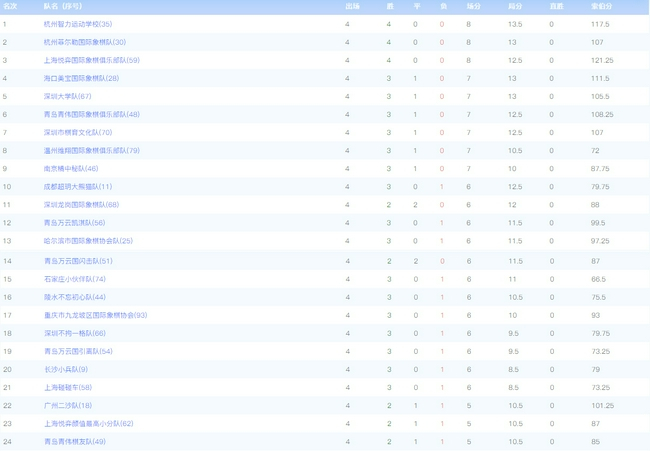 随着比赛的深入,实力强劲的队伍逐渐从100支海选战队中显露出来。10月2日,“机器人谷杯”中国城市国际象棋联赛海选赛第四轮比赛在智赛网鸣金。能保持四轮全胜的队伍仅剩3支,分别是杭州智力运动学校队、杭州菲尔勒队和上海悦弈俱乐部队。