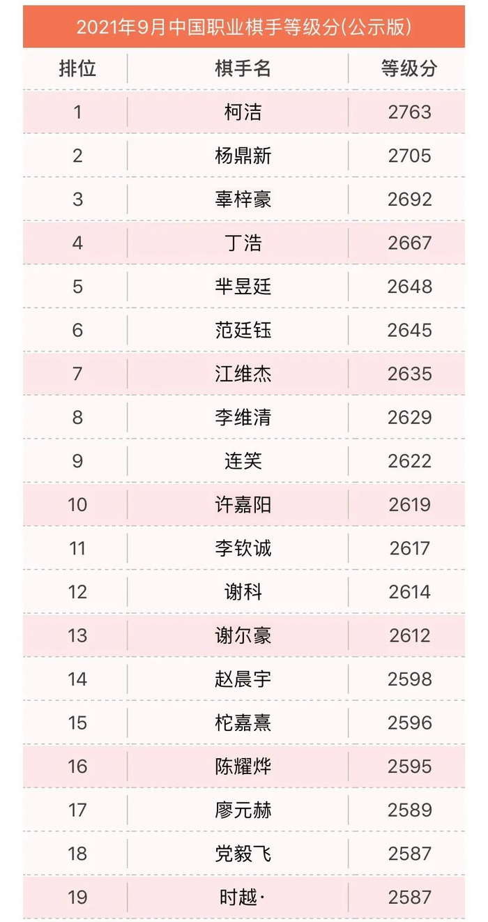 随着疫情好转,9月的等级分对局达310多局。柯洁状态不错,等级分从8月的2749分增长到2763分,杨鼎新等级分排名上升为第二。9月共五人升段:李维清升为九段,彭立尧升为八段,寇政岩升为五段,黄明宇升为五段,王硕00升为三段 。