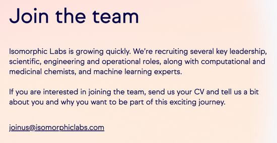 但即使有 DeepMind 的技术作为基础,Isomorphic 在这个问题上仍可看作基本从头开始。它正在招聘一支‘世界一流的多学科团队’,也许在一两年内,我们可能会看到它的初步结果。