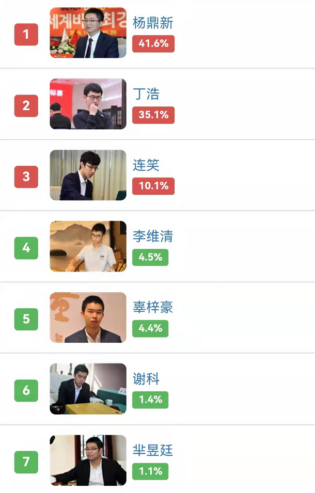 投票将于11月14日结束,截至目前,在投票榜单中位列前三的国手分别是:杨鼎新、丁浩、连笑。在中国围棋协会最新公布的中国职业棋手等级分排名中,杨鼎新在柯洁之后位列第二,在本周的LG杯半决赛中也成功战胜对手闯入第26届LG杯决赛;丁浩则是零零后棋手中的佼佼者,目前等级分位列第四,在前不久的倡棋杯决赛中战胜杨鼎新捧得桂冠;连笑目前国内等级分排名第八,曾包揽国内三大头衔,也多次在国内决赛中与柯洁交手,同时也与柯洁交情甚笃。