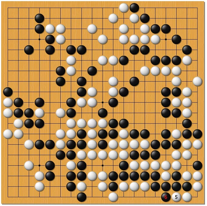 而白棋右上角吃掉黑全部,加上破坏黑棋的空总价值差不多接近60目,黑方就此奠定了胜势。