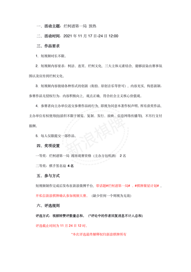 由新浪棋牌特策划举办“烂柯谱第一局”预热短视频大赛正在展开!将选出一等奖2两名,获得现场观赛资格(主办方包机酒);二等奖4名,获得棋手签名扇!