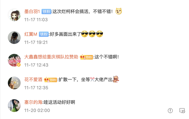 活动整体持续了一周,我们共收到15个投稿视频,视频总点击量10万+,很多棋迷为了此次活动也是特意新学习了剪辑技能。最终@皮皮屁屁月月(https://weibo.com/2488252651/L2ukfz0rt)、@小狮子shuile吗(https://weibo.com/7297868560/L2kccqaIL)两位转赞评综合位列前二,获得了最终的现场观赛名额~