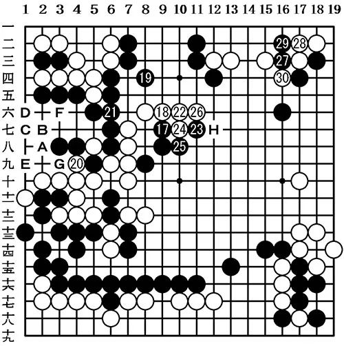 实战白26之后选择黑27和黑29,这个时候黑棋已经慢了一步,芝野虎丸说:“现在白H就已经可以了”。还保留了吃掉中央黑棋的可能性,上方还有余味。